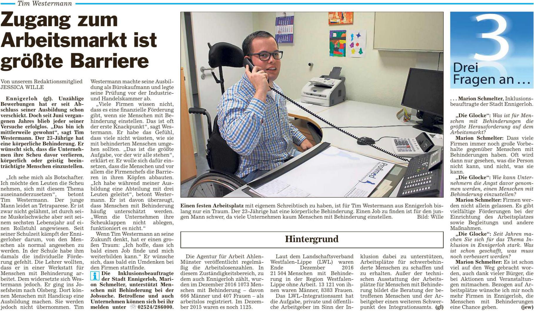 In Ennigerloh wurde eine Seniorenresidenz eröffnet. Schon vor der Eröffnung nahm die Inklusionsbeauftragte mit dem Leiter der Einrichtung Kontakt auf, um für Menschen mit Behinderungen zu werben. Die Anfrage wurde sehr positiv aufgenommen. Es wurden Gespräche mit Vertretern der Agentur für Arbeit, dem Integrationsfachdienst, den Freckenhorster Werkstätten und dem Leiter der Einrichtung organisiert. Erste Praktikumsstellen wurden nach der Eröffnung zur Verfügung gestellt und inzwischen gibt es die erste feste Anstellung. Ein Vorzeigeprojekt, welches aufzeigt was alles möglich ist.