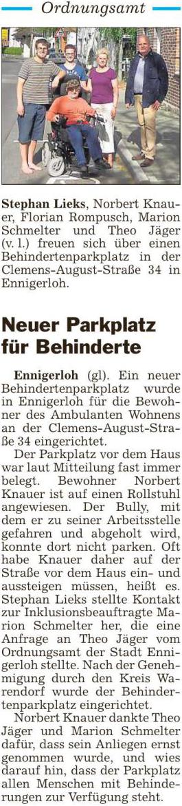 Jeder Bürger der einen Ausweis für einen Behindertenparkplatz besitzt, sollte die Möglichkeit haben an zentralen Stellen der Stadt und an seinem Wohnort einen Behindertenparkplatz nutzen zu können. Diese sind auch schon an vielen Stellen vorhanden. Trotzdem gibt es noch weiteren Bedarf.  Siehe Presseartikel: